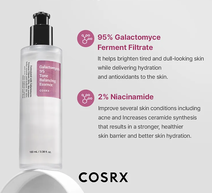 اسنس COSRX Galactomyces 95 Tone Balancing Essence با ۹۵٪ این ترکیب تخمیری، یکی از مؤثرترین محصولات برای افزایش درخشندگی، بهبود بافت پوست و تقویت سد دفاعی پوست است.